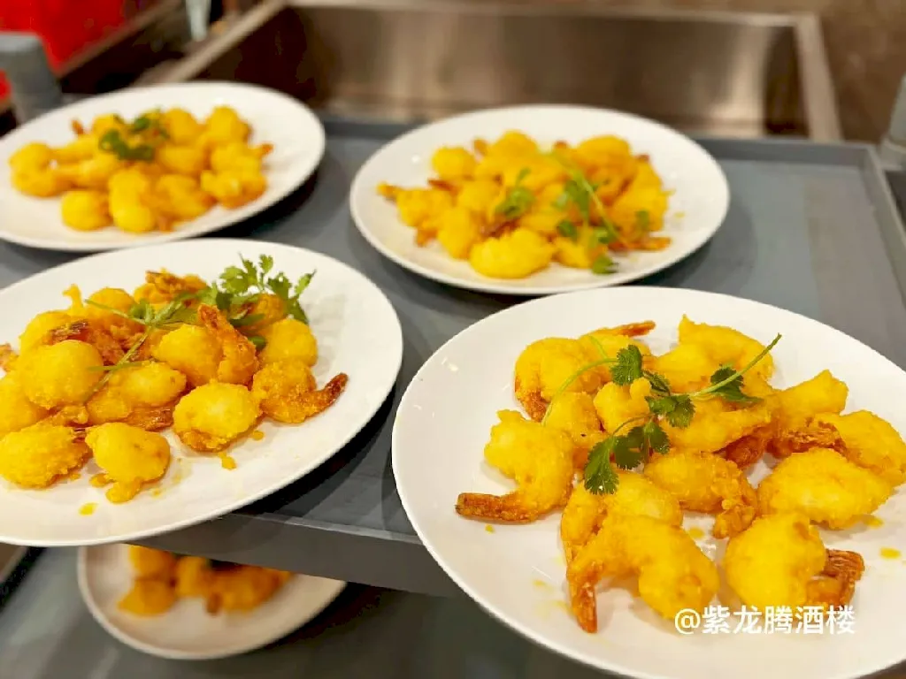 Plump shrimp coated in a rich egg yolk sauce, offering a creamy and luxurious seafood side dish.