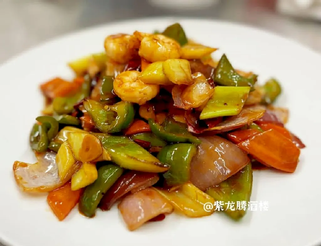 Plump shrimp stir-fried with peanuts and chili in a spicy Sichuan Kung Pao sauce, offering a bold flavor.